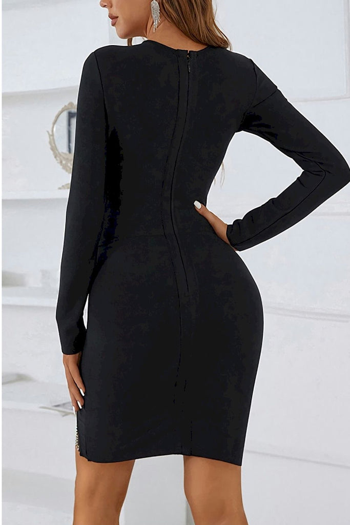 This stylish and sophisticated mini dress features a luxurious combination of rhinestone decor fishnet patchwork. Its slight stretch fabric, long sleeves, and zip-up closure is designed for maximum bodycon enhancement. Perfect for making a statement in the nightclub, it offers an exclusive and eye-catching look.