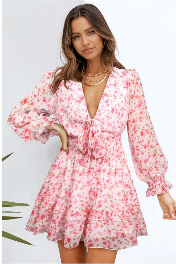 Look effortlessly chic in this Pink Deep V Neck Lantern Sleeve Knotted Tiered Mini Dress. Featuring a smocked waist for extra comfort and a gorgeous tier skirt, this dress is the perfect way to show off your summer style. Be the center of attention with this flirty and fashionable piece.