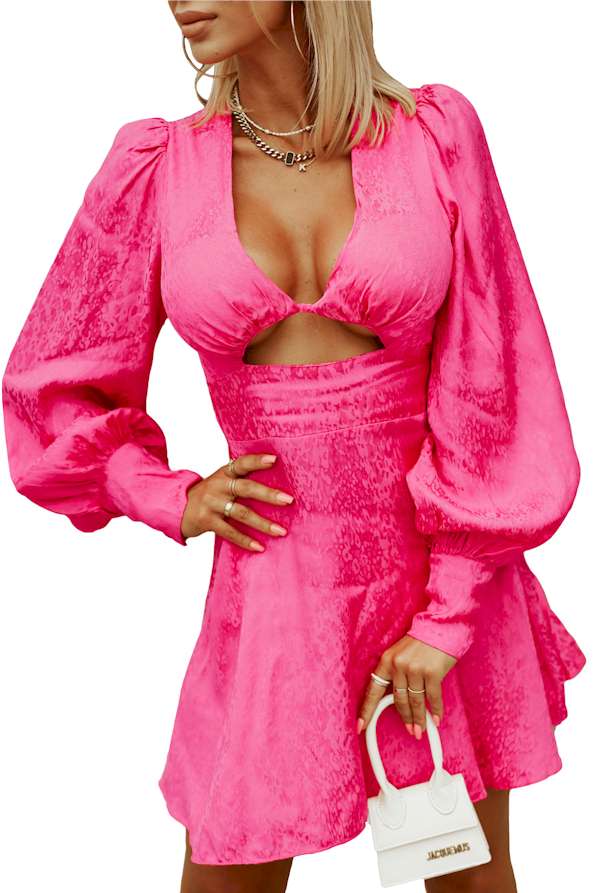 Rose Leopard Lantern Sleeve Front Cut-out Mini Dress