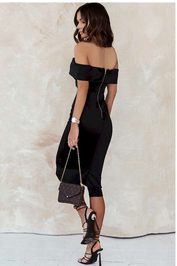 No matter the occasion, this chic dress is the answer. Featuring an off-the-shoulder neckline with V cut, padded bust and flattering midi silhouette in a curve-hugging fit., Back slit for convenient wear, it's an essential you'll wear again and again. Center back zipper closure.